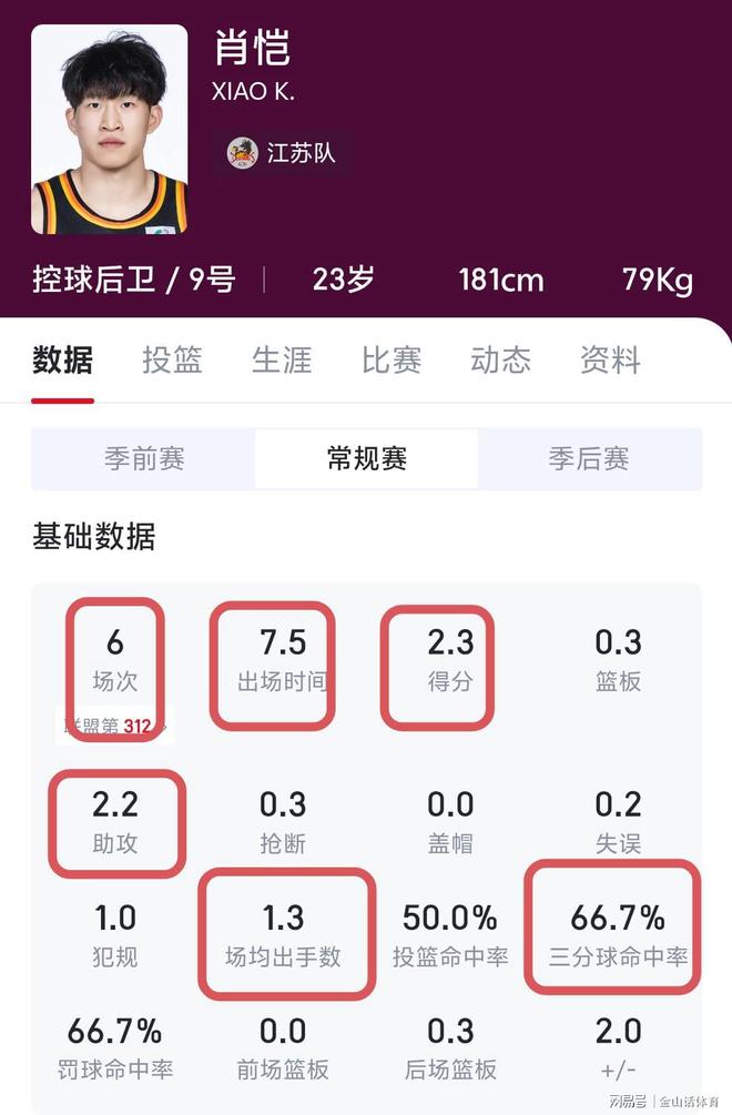 作为CBA一年级生,肖恺在加盟江苏队,出场机会并不多,本赛季只出场了6次,场均只有7分钟上场时间,平均1.3次出手机会,场均得分为2.3分,但能送出2.2次助攻,特别是他的三分命中率,达到恐怖的66.7%,外线堪称“百步穿杨”。