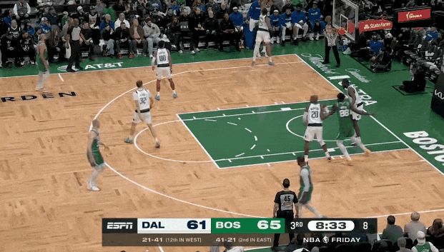 塔图姆尺寸视野出球协防,杰伦力量强攻中投领防。历来是塔图姆策动,杰伦攻坚。