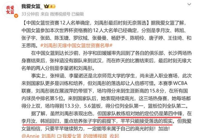 今天中国女篮正式公布了征战2026年女篮世界杯资格赛12人名单,他们是:李月汝、韩旭、张子宇、张茹、陈玉婕、罗欣械、张曼曼、杨舒予、陈明伶、唐子婷、王佳琦、和王思雨。而热身赛得分王刘禹彤落选。球迷们表现十分遗憾和可惜。
