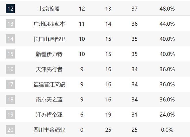 北控则巩固住了第12的位置,这轮他们击败了天津,并且领先第13的广州一个胜场。现在广州已经两连败了,他们要抓紧点了。
