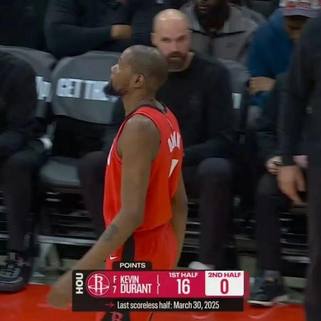 杜兰特上半场16分,下半场近乎于零分