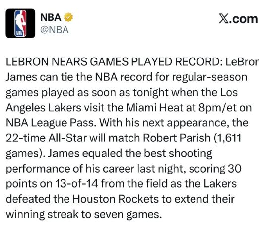 NBA官方祝贺!詹姆斯1611场追平帕里什并列历史第一 称霸多项纪录