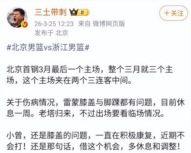 北京男篮最近的表现有些糟糕,连续被福建男篮和吉林男篮以下克上,主教练许利民的执教引发了很多北京球迷的不满。据媒体人“三土带刺”透露,北京男篮雪上加霜,球队锋线大将雷蒙的膝盖和脚踝都出现了伤病的情况,将会缺席一周的比赛,这对北京男篮来说是个非常糟糕的消息。