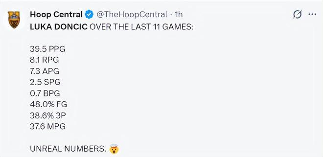 过去的11场比赛东契奇场均37.6分钟,拿到39.5分8.1篮板7.3助攻2.5抢断0.7盖帽,命中率48%,三分命中率38.6%。