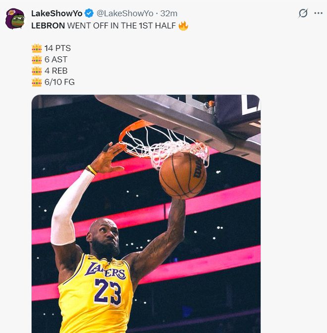41岁的詹姆斯首节9分钟,6中4,拿到8分2篮板2助攻,双手暴扣技惊四座,41岁的老头依旧可以飞天遁地,从他的表情能看出非常的坚毅。上半场打完詹姆斯17分钟,10中6,没有三分出手拿到14分6助攻4篮板1盖帽,没有东契奇的情况下他更多弧顶发牌。