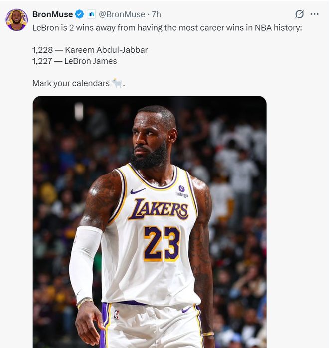 这场比赛勒布朗只要赢球就会迎来一项新的里程碑,他的胜场数1228场追平贾巴尔并列历史第一,还差1胜就独享历史第一胜场王。