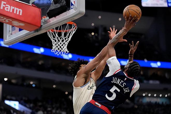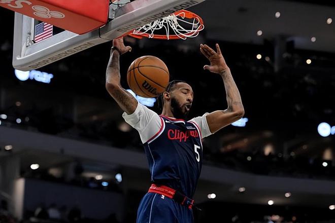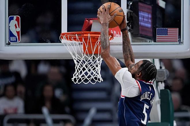 本场比赛中,快船的先发锋线大将小德里克-琼斯(Derrick Jones Jr.)也是将自己在各方面的特点充分发挥了出来。琼斯全场出场25分43秒,投篮9中6,三分线外1中1,拿下了13分4助攻2抢断1盖帽的数据,还有1次失误和4次犯规,正负值为+14。琼斯在进攻端展现出了全面的得分能力,他不仅有着很强的无球移动能力和攻筐能力,他也命中了1记外线投篮,他也是在出手次数不多的情况下展现出了自己的作用并且得到了不少分数,他甚至还展现出了一定的传球能力和策应能力。琼斯在进攻端状态不错,他在防守端的表现也是同样值得肯定的,他也是展现出了自己超强的防守能力,他在移动速度和运动能力方面的优势更是非常明显。总体来看,琼斯在场上的战术地位其实并不高,但是他也是在各方面都刷出了存在感并且为球队的胜利做出了自己的贡献。