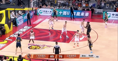 第三节陈家政再获先发机会领防庞峥麟,开局张皓嘉再丢空位三分,庞峥麟萨姆纳突破各造2罚,江苏升级了对萨姆纳的身体对抗强度,广东阵地战有些打不开,江苏也是同样。