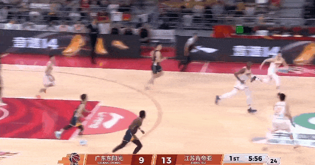 杜锋换回萨林杰张皓嘉,广东内线防守升级,奎因空接+三分+突破一条龙连再得7分、徐杰抛投也有,广东一波9-2反超江苏46-38!