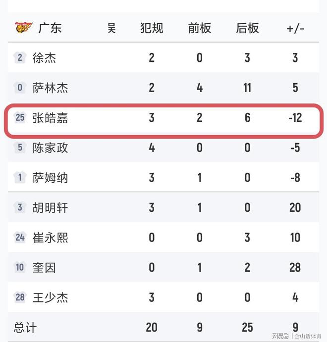 值得一提的是,本场比赛广东队的张浩嘉先抑后扬,在前3节进攻端0分情况下,末节迎来爆发。此役,张皓嘉出战27分钟,投篮8中4、三分6中2得到10分8篮板,另有2助攻2盖帽进账,由于张皓嘉前3节表现平平,所以尽量他末节独取10分,但场上正负值为-12,仍排在全队倒数第一。而张浩嘉此役得到10分,也是本赛季首次得分上双……