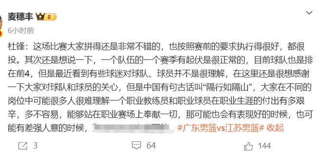 赛后杜锋罕见在发布会上喊话广东球迷要包容球队(杜锋说了将近5分钟,非常少见),还说了很多话鼓励和肯定张皓嘉这段时间的贡献。