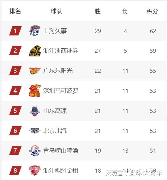 11冠王广东队,在上一轮大胜四川队以后,广东队这一战回到主场,迎战老对手江苏队。由于此前曾被江苏队绝杀过,广东队这一战极为谨慎,球队最终也有惊无险,在主场成功复仇对手。拿下江苏队以后,广东队的战绩变成22胜11负,又一次重返积分榜第三名。而深圳、山东、北京,这三队则由于少赛一场的缘故,球队排名稍微吃亏,这其中北京队更是下滑到积分榜第6。