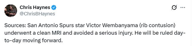 这么一来,至少对文班亚马和马刺来说,可以稍微松一口气了。马刺现在的目标根本不是常规赛,他们在追求更重要的东西。那么在文班复出之前,马刺方面在权衡什么?