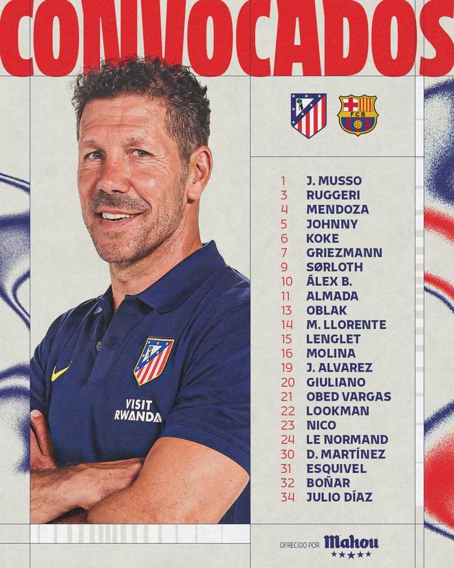 前锋:7-格列兹曼、9-瑟洛特、10-巴埃纳、11-阿尔马达、19-阿尔瓦雷斯、20-朱利亚诺-西蒙尼、22-卢克曼、23-尼古拉斯-冈萨雷斯