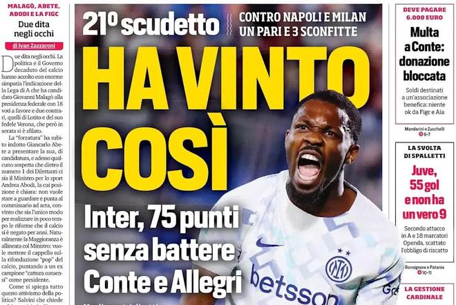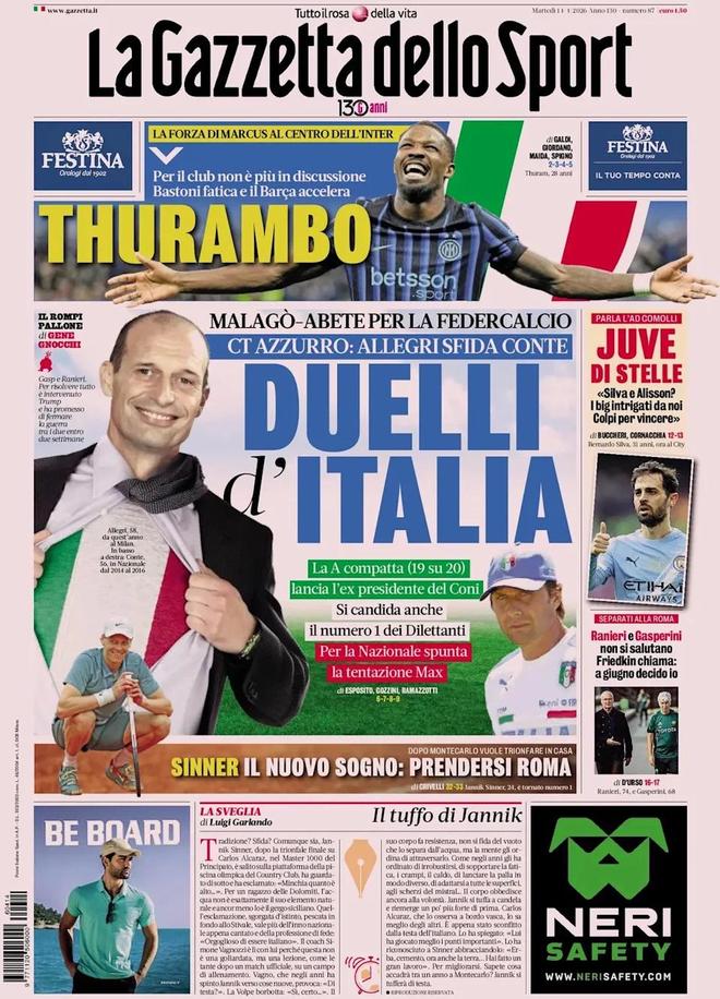 足协主席选举的连锁反应直接波及国家队帅位。《米兰体育报》用「Azzurri CT: Allegri battles Conte」定义这场博弈——两位前尤文、前国米冠军教头,风格迥异,人脉交错。
