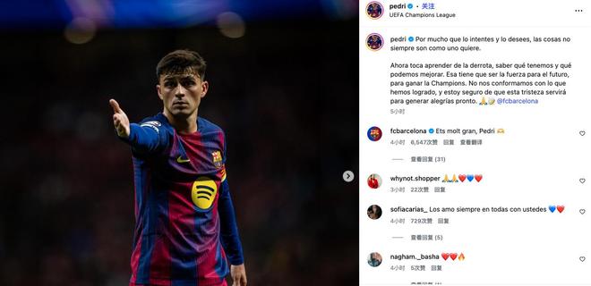 佩德里表示:“再怎么努力、再怎么想赢,结果也不一定都会如愿。现在我们要做的,就是从这场失利里吸取教训,认清球队现在有什么,也看清还有哪些地方需要提升。这些都应该成为我们未来继续前进的动力,去争取在接下来的几年里赢下欧冠。我们不会满足于现在取得的成绩,这份失落也必须在未来变成更多的喜悦。”
