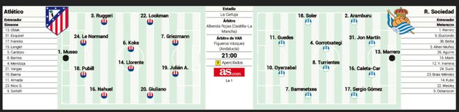 马竞:穆索;莫利纳,勒诺尔芒,普比利亚,鲁杰里;朱利亚诺·西蒙尼,略伦特,科克,卢克曼;阿尔瓦雷斯,格列兹曼