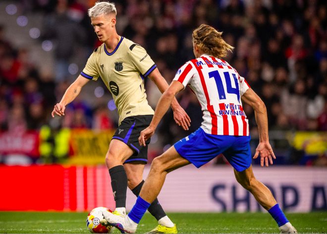 第43分钟,马竞再次打穿巴萨的左路防线,小西蒙尼的传球稍稍有些大,卢克曼跟进没能碰到皮球,怒捶草皮。