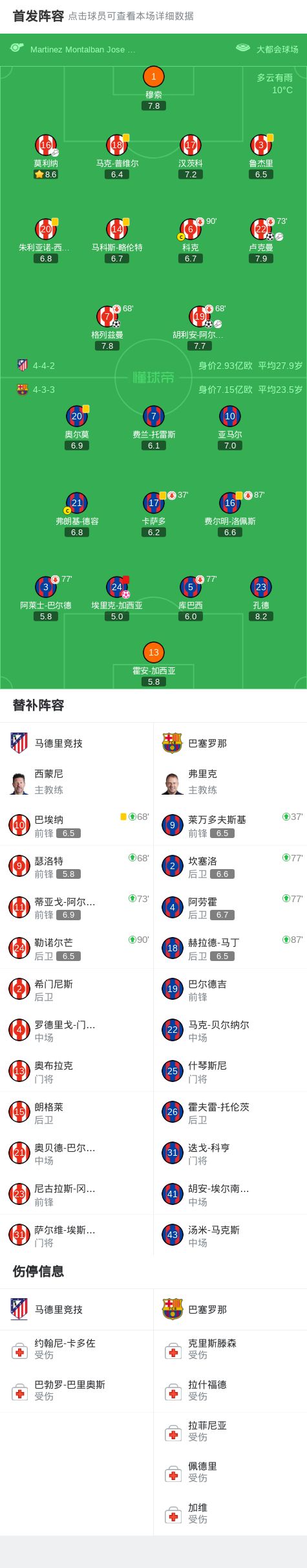 第68分钟,格列兹曼,阿尔瓦雷斯被换下,瑟洛特、巴埃纳替补登场