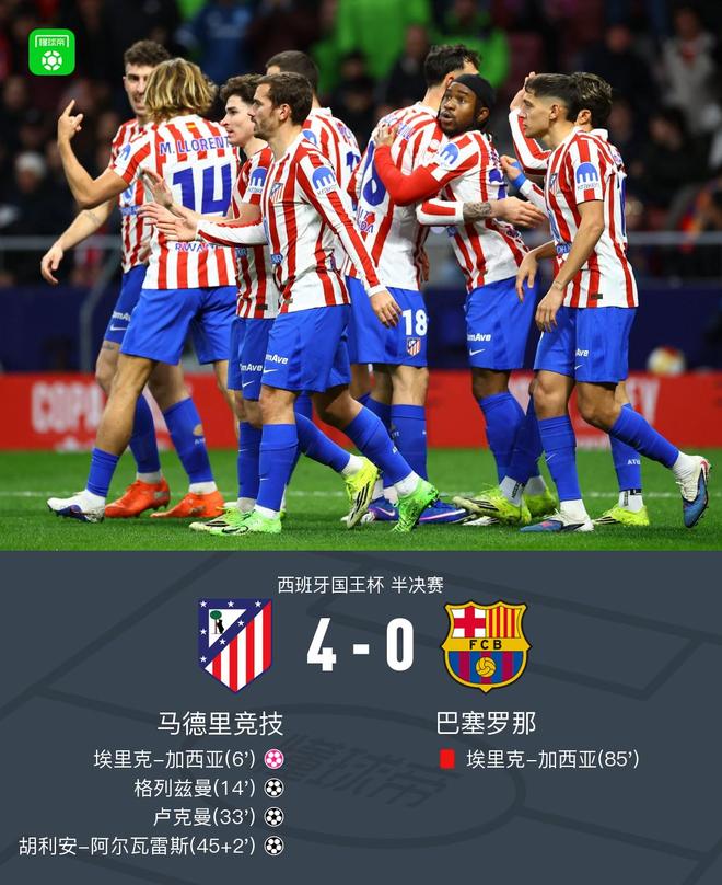 北京时间2月13日西班牙国王杯 半决赛,马德里竞技对阵巴塞罗那。上半场开场不久,埃里克-加西亚回传,霍安-加西亚将球停进自家球门,随后,巴萨后防线形同虚设,格列兹曼、卢克曼,阿尔瓦雷斯相继进球。下半场,埃里克-加西亚放倒单刀机会的巴埃纳,裁判出示红牌将其罚下。最终比分马竞 4-0 巴萨。