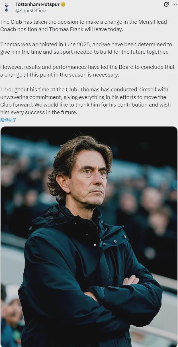 官方:热刺宣布解雇了托马斯-弗兰克。