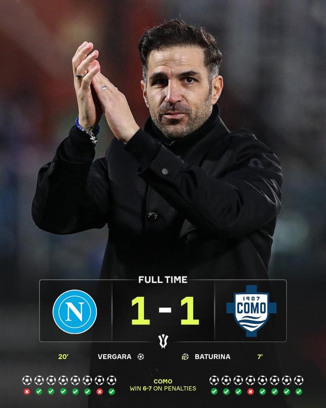 意大利杯1/4决赛,90分钟1-1,点球大战鏖战到第8轮,最终科莫以总比分8-7掀翻那不勒斯。卫冕冠军倒下,法布雷加斯带队杀入四强,他们的对手正是强大的国际米兰!