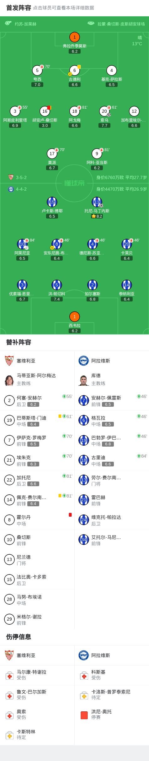北京时间2月15日西班牙足球甲级联赛 联赛 第24轮,塞维利亚主场对阵阿拉维斯。塞维利亚索乌破门。阿拉维斯托尼-马丁内斯破门。最终比分塞维利亚 1-1 阿拉维斯。