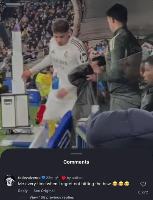 巴尔韦德本人赛后在社媒也进行了回应,他评论433的社媒表示:“这就是我每次后悔当时没射门的样子。”