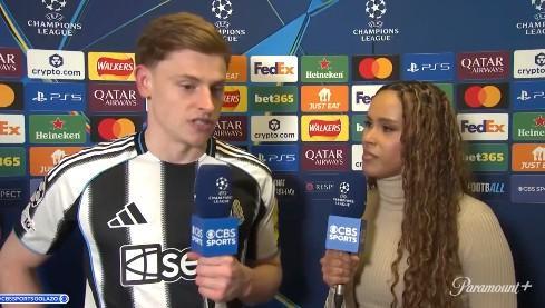 欧冠1/8决赛首回合,纽卡主场1-1战平巴萨,纽卡前锋哈维-巴恩斯赛后接受了CBS体育的采访。