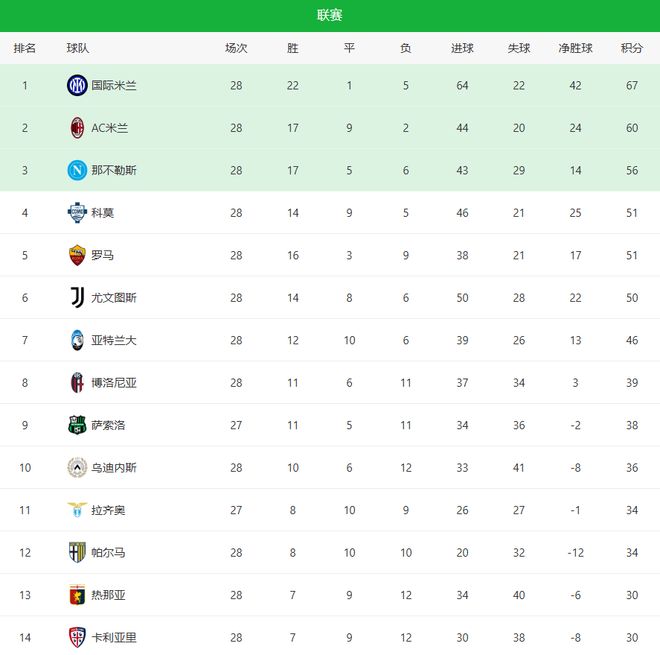 虽然输掉德比,但国际米兰依然以67分继续领跑积分榜;AC米兰则拿到60分,将双方差距缩小到7分。不过考虑到联赛所剩轮次不多,红黑军团想要真正威胁冠军依然难度极大。