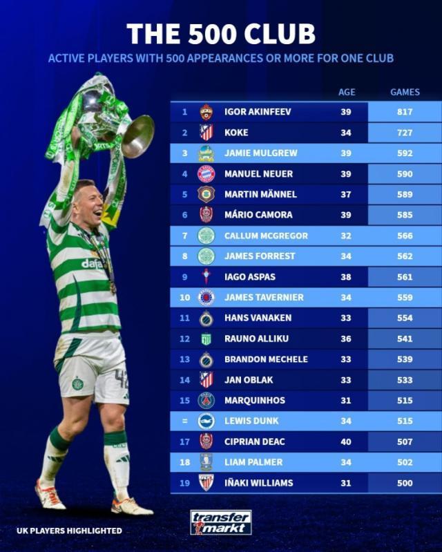 毕尔巴鄂前锋伊纳基·威廉姆斯如今已为球队出战500场比赛,在现役球员中排名第19位。在现役球员中,为单一俱乐部至少出战500场比赛的球员中,阿金费耶夫以817场居首,科克以727场位居次席,诺伊尔则以590次位居第4位。