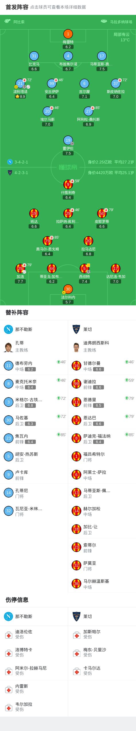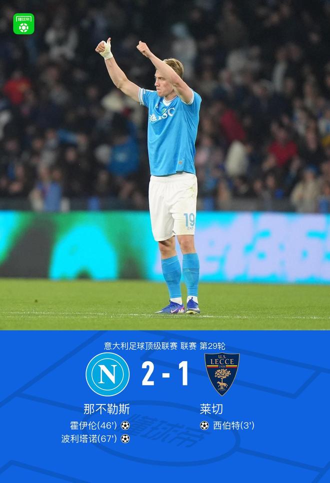 第46分钟,扳平比分,波利塔诺助攻,霍伊伦抢点破门,那不勒斯1-1莱切