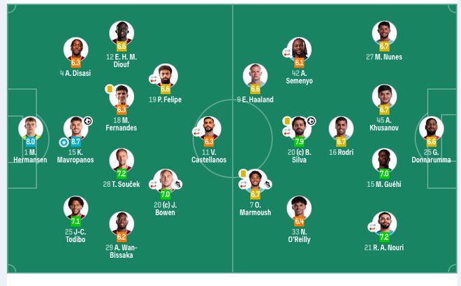 曼城首发:25-多纳鲁马、27-努内斯、45-胡桑诺夫、15-格伊、21-努里(60’10-谢尔基)、16-罗德里、20-B席(74’47-福登)、33-奥赖利、7-马尔穆什(60’11-多库)、42-塞梅尼奥(75’4-赖因德斯)、9-哈兰德