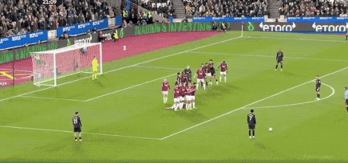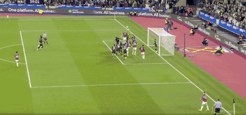 第27分钟,努里强行传中,西汉姆联两名防守球员起跳晃点了哈兰德,哈兰德的头球没能顶正部位。