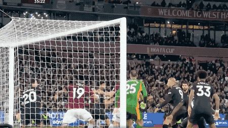 第35分钟,西汉姆联的第一次射门就扳平比分,多纳鲁马出击失误,马夫罗帕诺斯头球破门。