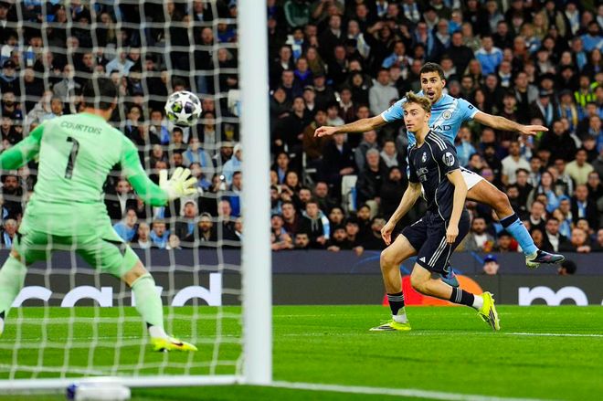 第5分钟,曼城卷土重来,罗德里插上后小角度爆射,库尔图瓦封住了角度。
