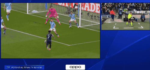 皇马的进攻还在继续,维尼修斯的射门,被B席位在门线上挡出,皇马球员示意B席手球犯规。
