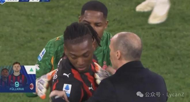 然后就是本场的名场面了(上一次在比赛期间爆发将帅矛盾貌似还是“补水事件”,对手依旧是拉齐奥,主角依然有莱奥):阿莱格里选择换下莱奥,麦尼昂跨越半场过来安抚,莱奥对主帅的拥抱表现出明显抵触。
