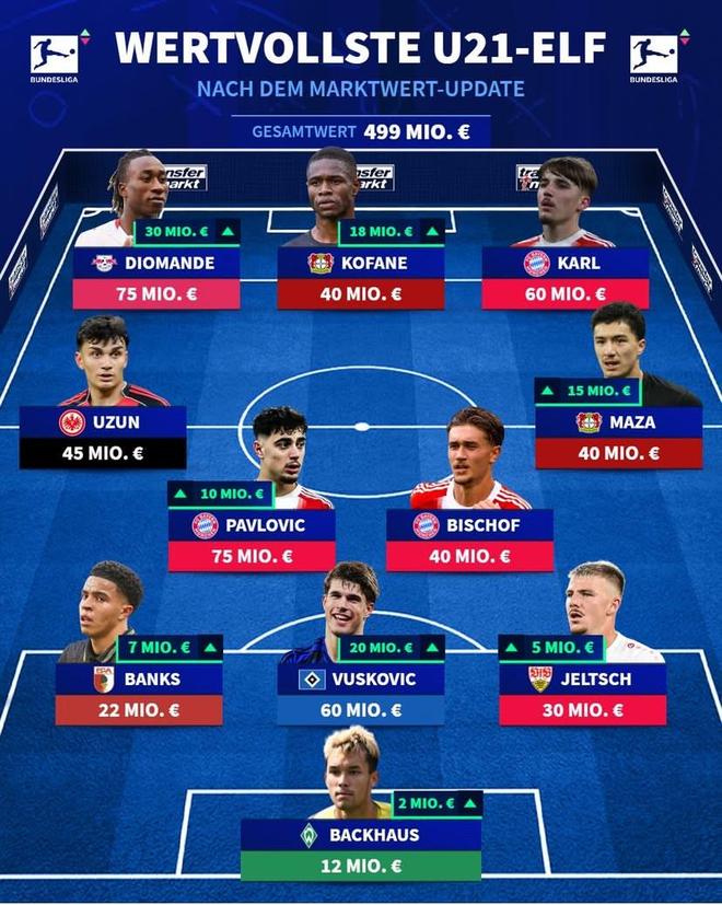 北京时间3月21日,在更新了德甲球员的身价之后,德转还列出了更新之后德甲最贵的U21阵容,扬-迪奥曼德和亚历山大-帕夫洛维奇同以7500万欧元的身价领衔,伦纳特-卡尔、比朔夫、詹-乌尊以及卢卡-武什科维奇在列。