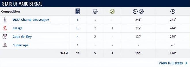 本赛季贝尔纳尔复出之后,已经为巴萨在各项赛事中出战26场,一共踢了970分钟。弗里克最初对他的使用非常耐心,直到德容受伤后,才让贝尔纳尔重新成为先发,出任球队后腰。
