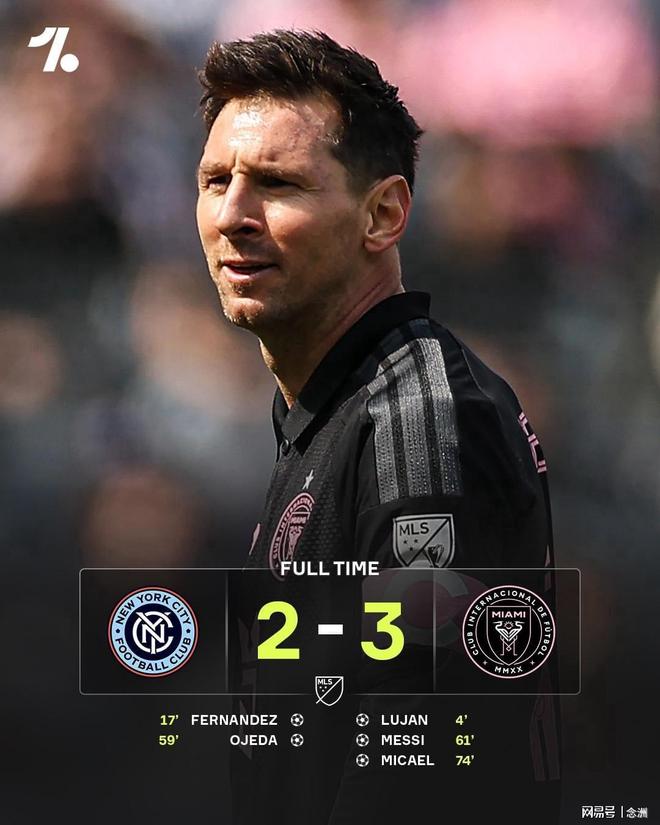 美职联第5轮,迈阿密国际客场3-2险胜纽约城,终结各赛事3连平,距榜首3分。卢扬3分钟首开纪录,梅尔考任意球扳平,梅西两度中框,奥耶达反超比分,梅西任意球破门追平+生涯第901球,米凯尔头球建功。
