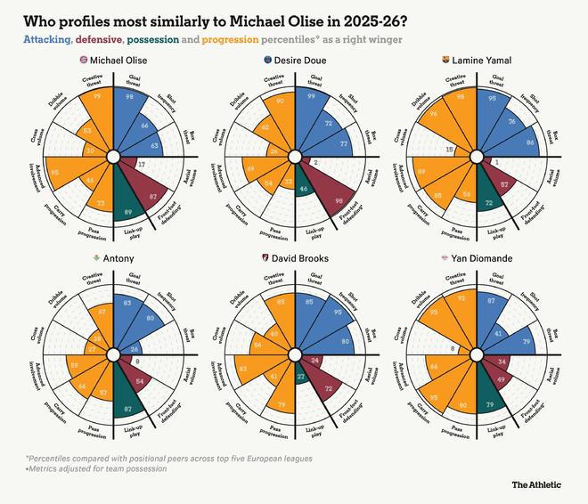 目前很少有左脚右边锋能达到更高的水准:在欧洲五大联赛中,没有人能比奥利塞的17次助攻更多。他拥有沉肩变向、在防守球员间穿梭以及在高速奔跑中完成致命一击的能力,让他成为足坛稀缺的“异类”球员。。