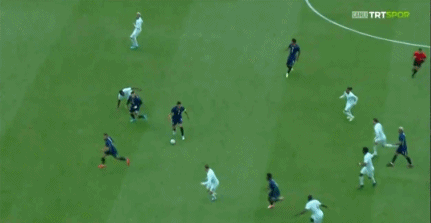 第31分钟,法国队率先打破僵局。登贝莱送出直塞,姆巴佩前插得球后突入禁区右侧,面对出击的埃德森,姆巴佩单刀挑射破门,场上比分变为1-0。
