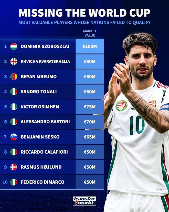 德转统计出无缘2026年美加墨世界杯的球员身价TOP10,索博斯洛伊以1亿欧元居首,意大利4人上榜。