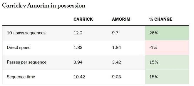 本赛季初,阿莫林明确推行更快、更直接的踢法,而在卡里克执教后,这一节奏几乎没有下降——从每秒1.84米降至每秒1.83米。
