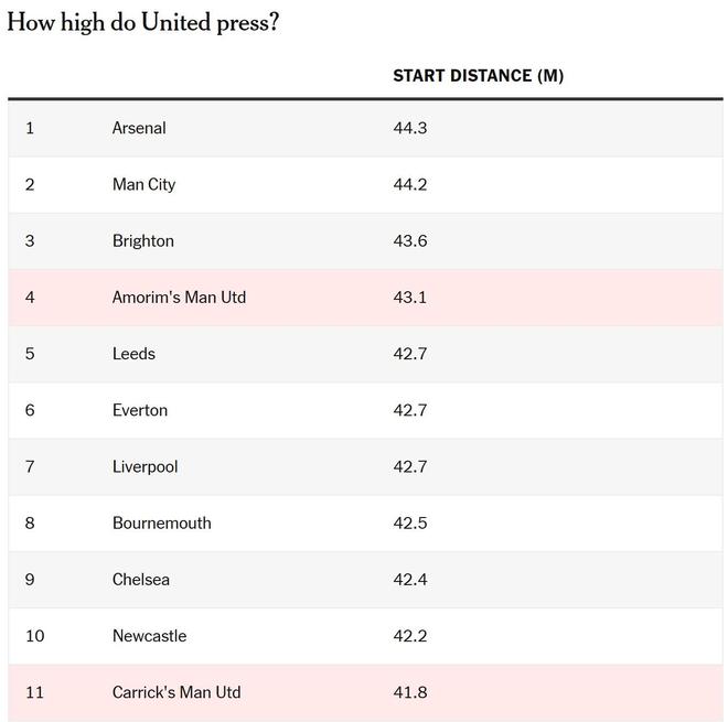 曼联压迫时的平均起始距离从43.1米降至41.8米。单看这一原始数据,差异似乎不大,但与联赛其他球队相比,这一变化更为明显。