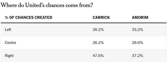这一点也体现在传中数据上:卡里克执教期间,曼联近三分之二的传中都来自右路。