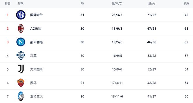 在积分榜上,国际米兰以72分高居榜首,战绩是23胜3平5负。AC米兰排名第2,只拿到63分。国际米兰在多赛一场的情况下领先AC米兰9分。这样的领先优势很大了。冠军恐无悬念。那不勒斯排名第3,拿到62分。第4名的是法布雷加斯率领的大黑马科莫,拿到57分。尤文图斯54分排第5。罗马输球之后,依然是54分,排名第6,想要获得欧冠资格难度变得更大了。