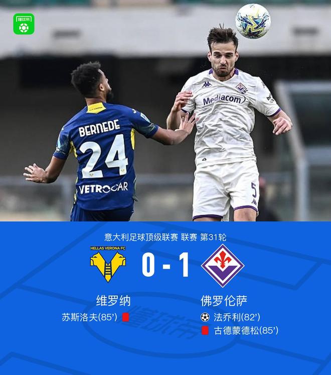 北京时间4月5日意大利足球顶级联赛第31轮,维罗纳主场对阵佛罗伦萨。下半场法乔利破门制胜,苏斯洛夫与古德蒙德松肢体冲突两人双双被红牌罚下。最终比分维罗纳 0-1 佛罗伦萨。