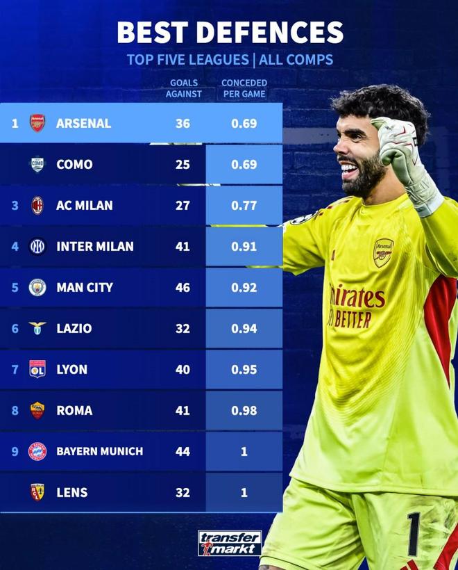 北京时间4月8日,阿森纳在欧冠1/4决赛首回合的比赛中客场1-0击败葡萄牙体育,赛后德转统计出了本赛季至今欧洲五大联赛场均丢球数最低的10支球队,枪手与法布雷加斯执教的科莫同以0.69球排名第一。